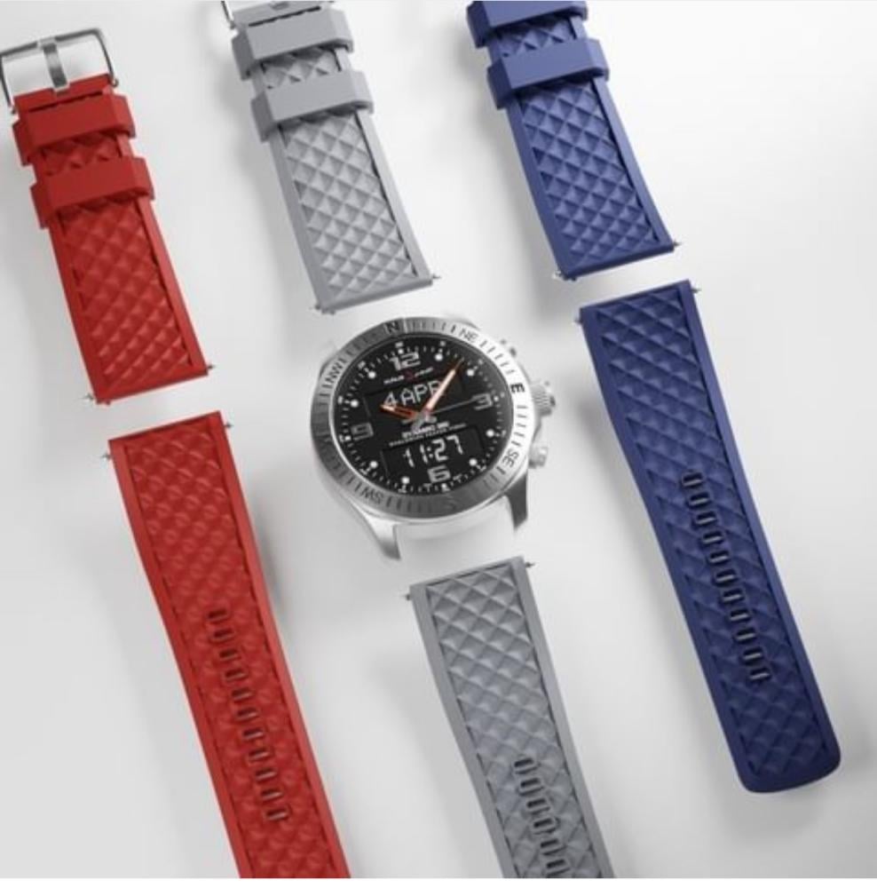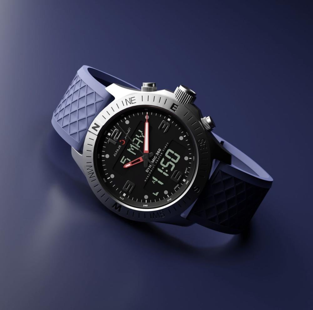 ساعة ديناميكية مزودة بتوقيت عقارب و رقمي متزامن تعرض التاريخ ومواقيت الصلاة، مصنوعة مصنوعة من فولاذ بدرجة 316، وزجاج من الياقوت المضاد للانعكاس، تاج رقمي، وحزام من المطاط.