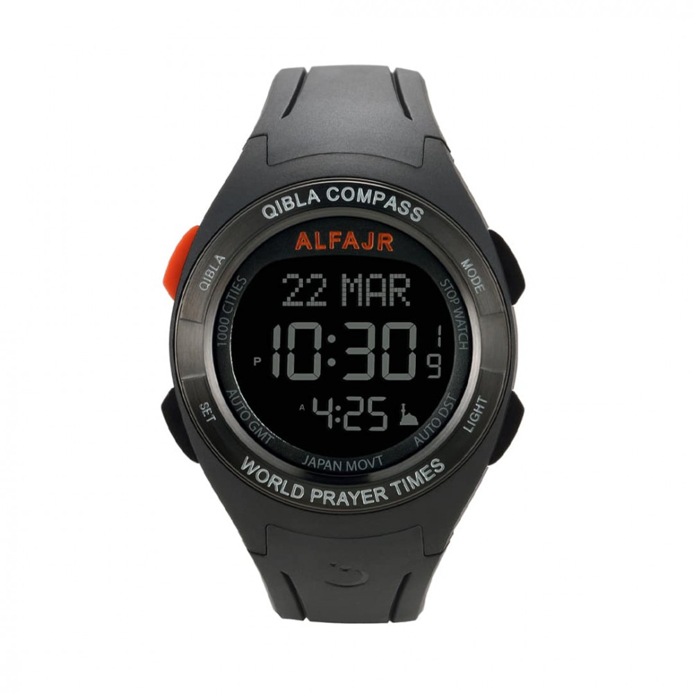 ساعة ذات إطار دائري وحـزام من البلاستيـك، مزودة بـشاشة بـلوريـة FSTN مع إضـاءة خلفيـة. زر مخصص لتحديد اتجاه القبلة
