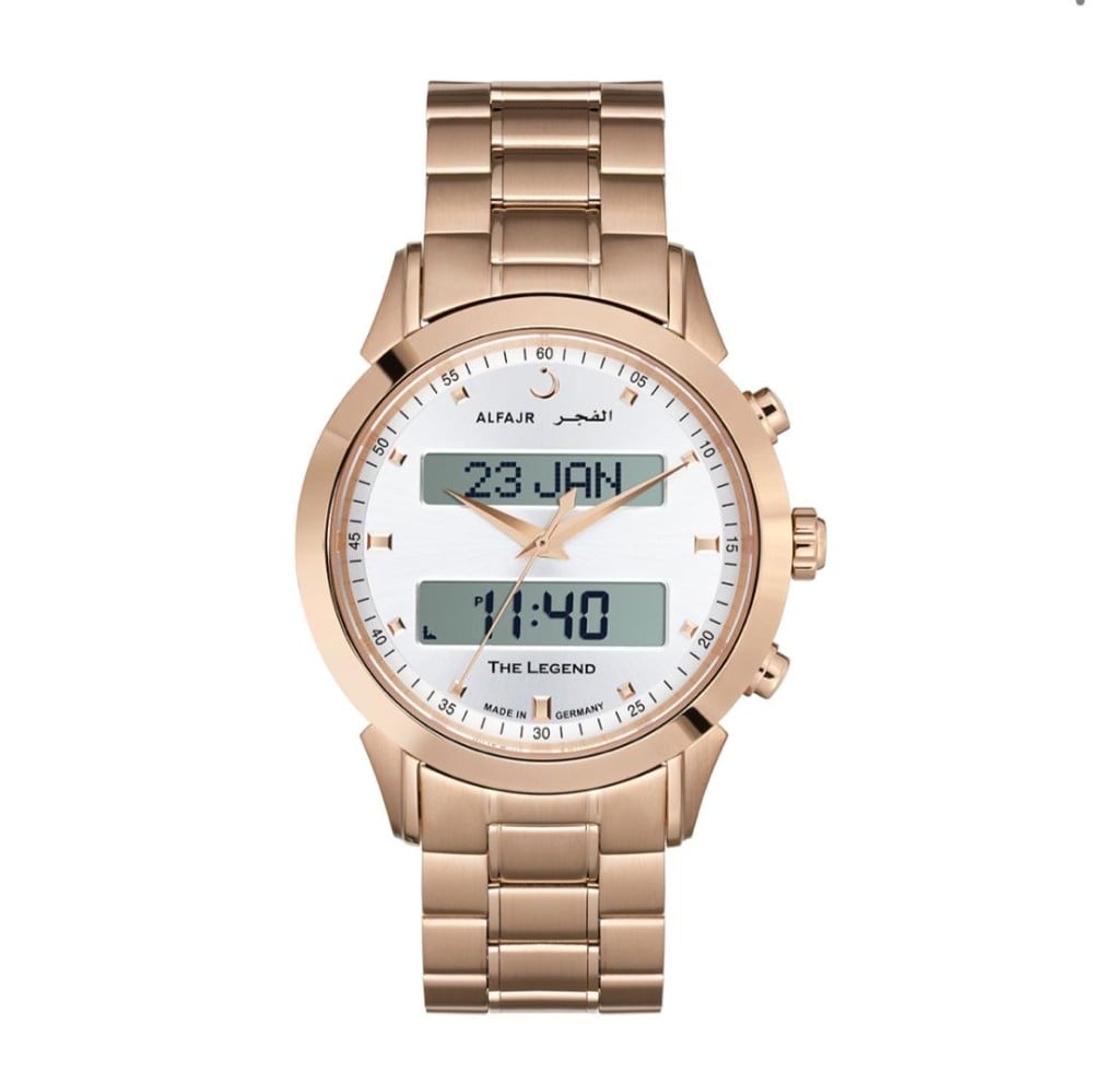 ساعة رجالية فاخرة مزودة بتوقيت مزدوج (عقارب ورقمي) تعرض التاريخ و مواقيت الصلاة. إطار من الفولاذ الصلب المصقول. زجاج من الياقوت المضاد للخدش. تاج متعدد المهام.وحزام من الفولاذ. الميناء والشاشة البلورية. يتوفران باللون الأبيض أو الأسود.