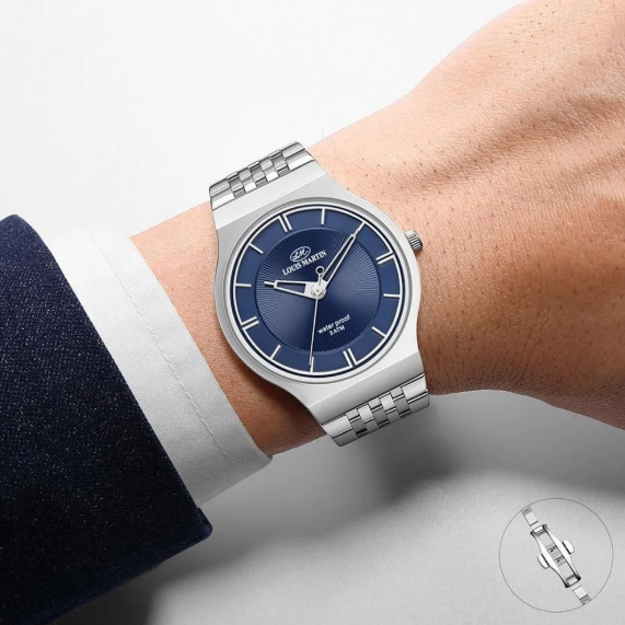 بالنسبة للرجال، تقدم لويس مارتن ساعات تعكس القوة والصلابة مع المحافظة على الأناقة. تصاميمها الرجالية عادة ما تكون مزودة بأحزمة من الفولاذ المقاوم للصدأ أو الجلد الطبيعي، لتوفر خيارات تناسب جميع الأذواق. كما أن الأرقام والمؤشرات في المينا مصممة بشكل واضح يسهل قراءة الوقت بدقة.
